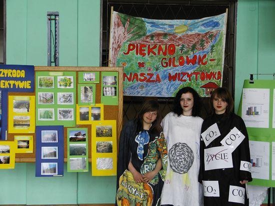 Obchody Dnia Ziemi w gilowickim Gimnazjum swój finał miały w piątek 28 kwietnia br. Jednak akcja trwała już dużo wcześniej. Cykl imprez i całe obchody przygotowały i przeprowadziły nauczycielki Gimnazjum p. mgr Lidia Harędzińska i p. mgr Krystyna Krzak. Młodzież brała udział w licznych ciekawych konkursach związanych z ochroną środowiska i pięknem otaczającej nas przyrody jak np. konkurs fotograficzny, literacki. Każda klasa wspólnie opracowywała i wykonywała plakat, hasło, transparent i kreacje na pokaz mody ekologicznej.