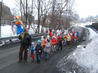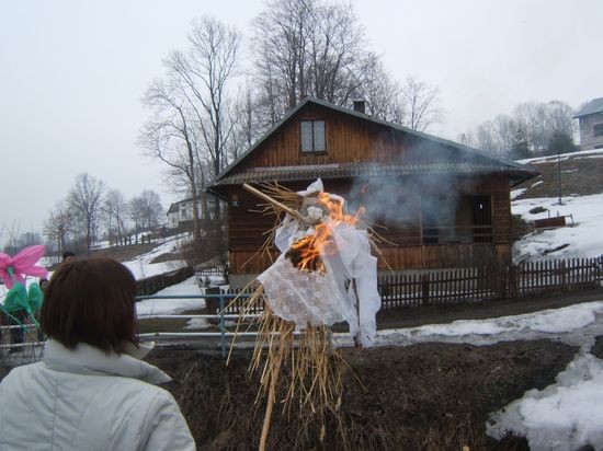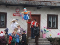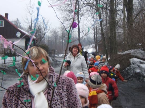 W pierwszym dniu wiosny, przed Przedszkolem w Rychwałdzie zakwitły dwa maleńkie przebiśniegi i kilkanaście bibułkowych, kolorowych kwiatów. W tym dniu, dzieci wraz paniami, powędrowały nad potok, tam gdzie nurt jest najszybszy. Towarzyszyły nam kukły Marzanny – symbolu zimy. Jedna Marzanna gruba, kolorowa- tę przygotowała Pani z grupy młodszej. Druga: chuda z warkoczykiem w biało-słomianych szatach – z grupy starszej. Dzieci wykrzykiwały: „Precz zimo zła!”, hałasowały grzechotkami, kołatkami, tamburynem i tarką. Palące się marzanny wrzuciliśmy do potoku, przy śpiewie piosenek pt: „Marzanno odpływaj”, „Marzanna” i przy wspólnym czarowaniu –