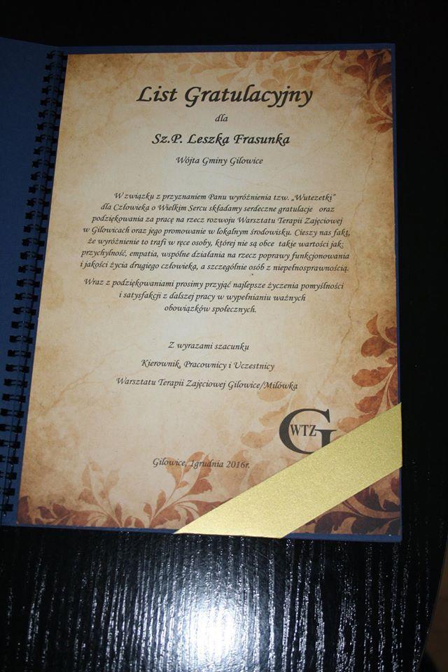 Podczas Międzynarodowego Dnia Osób Niepełnosprawnych została wręczona WUTEZETKA z listem gratulacyjnym dla Wójta Gminy Gilowice Leszka Frasunka w podzięce za wieloletnie wsparcie, pomoc i przyjacielską postawę dla naszego WTZ.